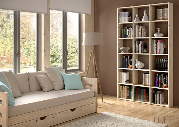 Y si optas por el cajón base tendrás una cama con almacenamiento extra, perfecta para mantener la habitación o el salón recogidos. Además, son combinables con el resto de los muebles LUFE, estanterías, percheros etc de la colección.