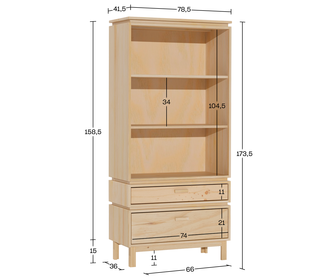 Estantería baja con dos cajones para almacenar libros y objetos decorativos. Ideal para espacios de estudio y trabajo. Un mueble que combina funcionalidad y diseño, pensado para adaptarse a diferentes espacios de tu hogar. Fabricado con madera ecológica, es un versátil mueble de almacenaje que aporta un estilo fresco y atemporal. Ideal para quienes buscan soluciones prácticas sin renunciar al diseño.