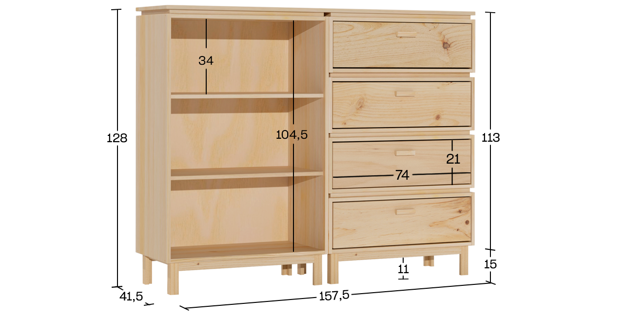 Este es un mueble sostenible y reciclable con certificación PEFC. Fabricado con madera maciza ecológica de pino insignis, procedente de bosques locales y sostenibles.