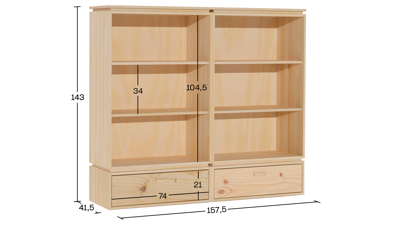 Estantería doble de madera natural con cajones de almacenaje para libros y objetos decorativos. Ideal para salas de estar o espacios de estudio y trabajo. Un mueble que combina funcionalidad y diseño ecológico, pensado para adaptarse a diferentes espacios de tu hogar. Organiza y almacena de forma eficiente, sin renunciar al estilo.