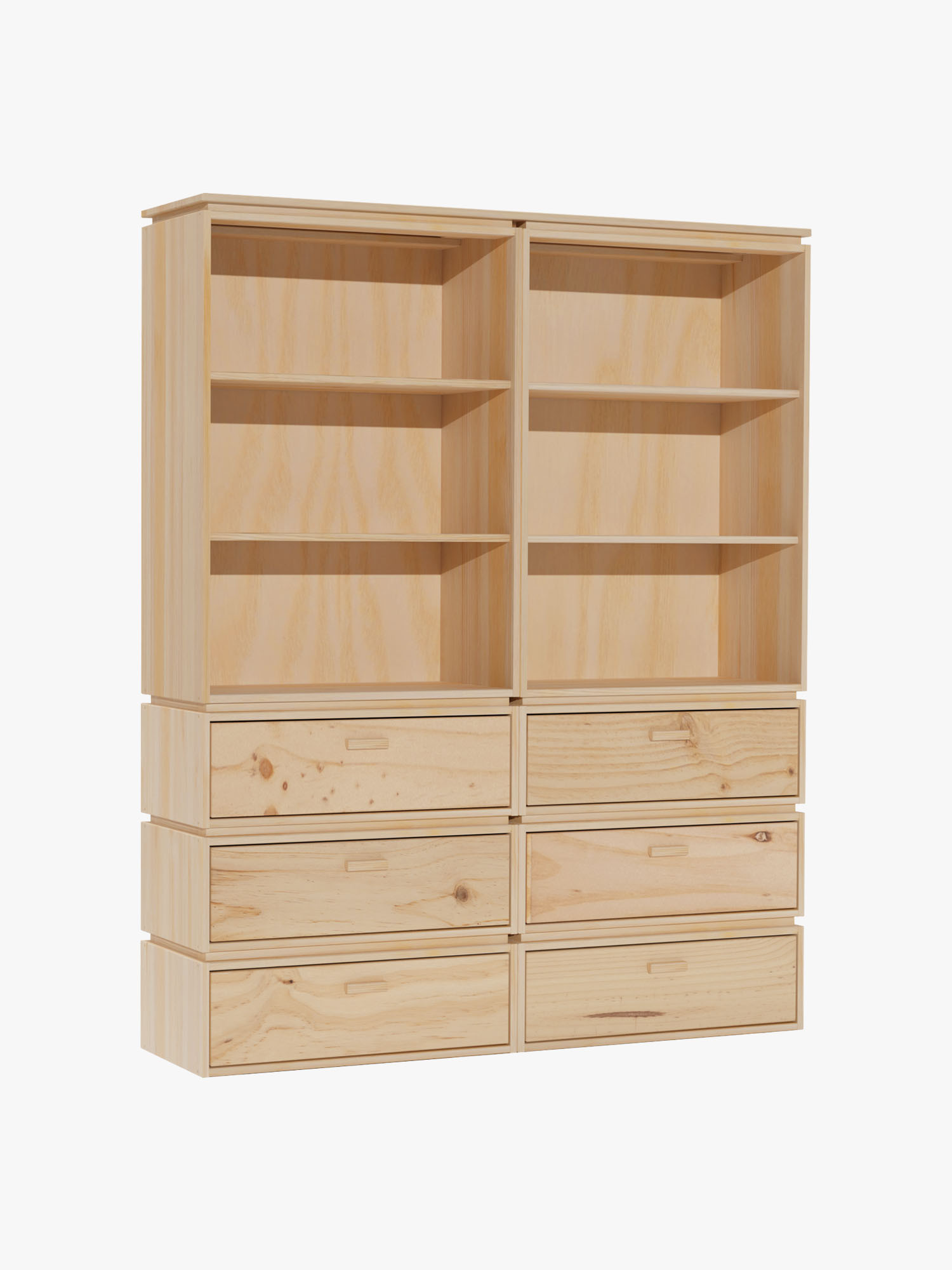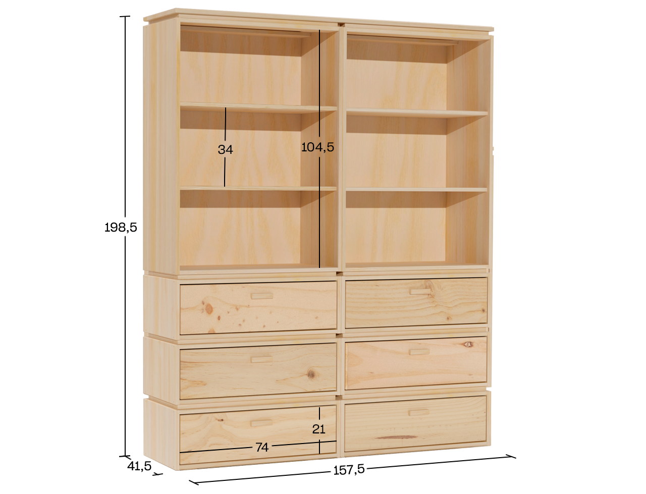 Estantería doble de madera natural con sesi amplios cajones de almacenaje para guardar libros, objetos decorativos, ropa, menaje o complementos. Ideal para salas de estar o espacios de estudio y trabajo. Un mueble que combina funcionalidad y diseño ecológico, pensado para adaptarse a diferentes espacios de tu hogar. Organiza y almacena de forma eficiente, sin renunciar al estilo.