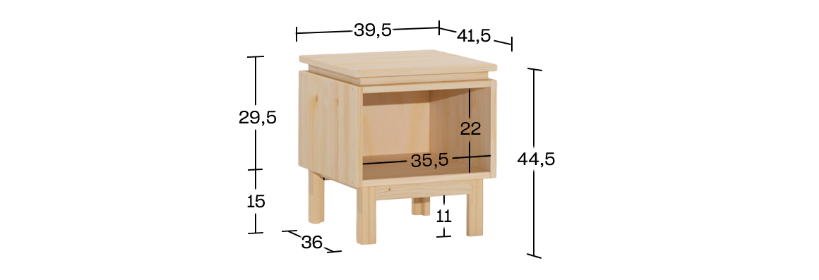 Mesita de noche modular de madera de pino maciza y natural, con hueco abierto y patas. Ideal para camas bajas, habitaciones infantiles o espacios reducidos. Fabricada con madera local y certificada, en el estilo sencillo y natural de LUFE.