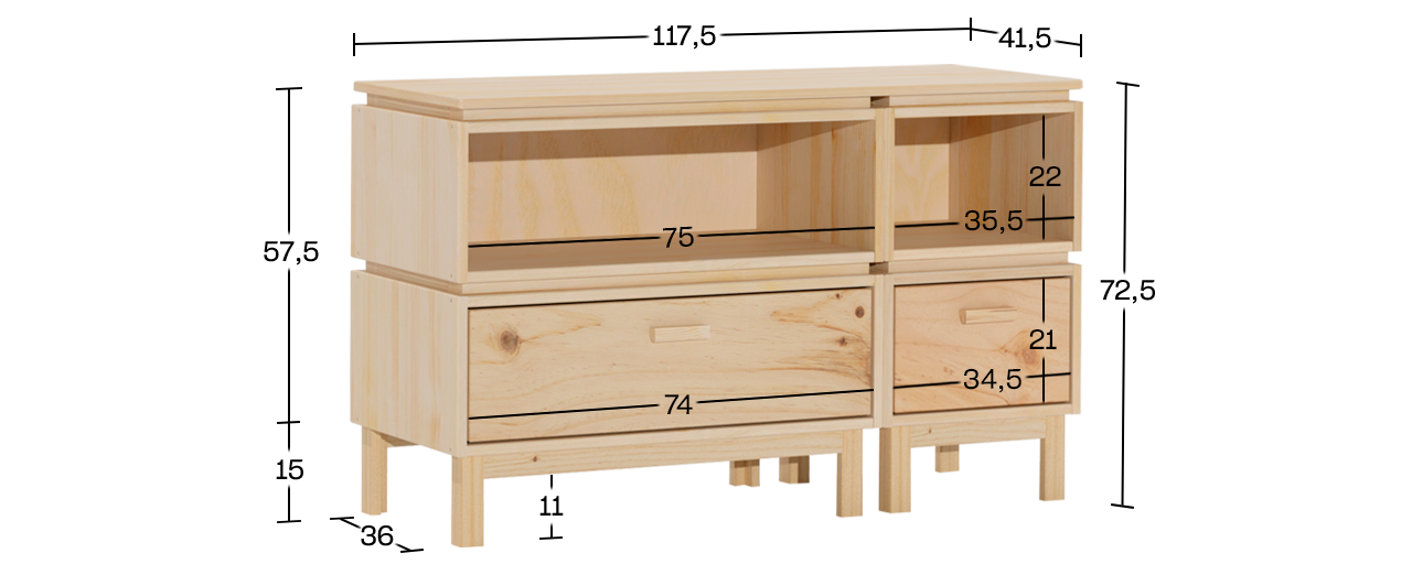 Este es un mueble sostenible y reciclable con certificación PEFC. Fabricado con madera maciza ecológica de pino insignis, procedente de bosques locales y sostenibles.